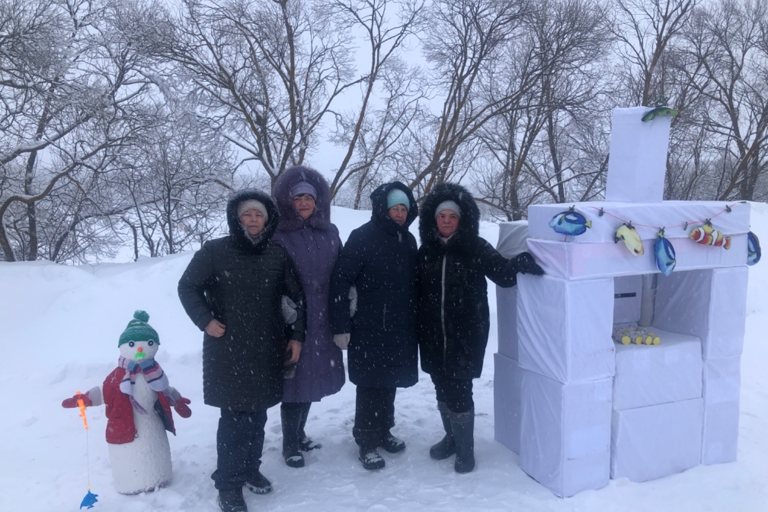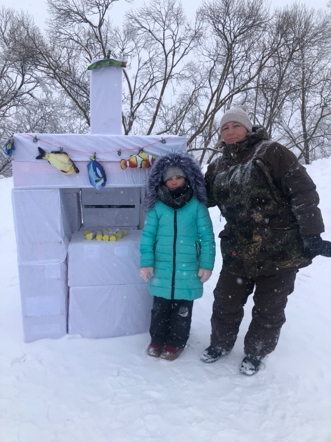 Пока рыбаки ловили рыбу, дети и взрослые гости строили снежную крепость, катались на ватрушках, водили хоровод, пили горячий чай с пирожками, играли в снежки и перетягивали канат.